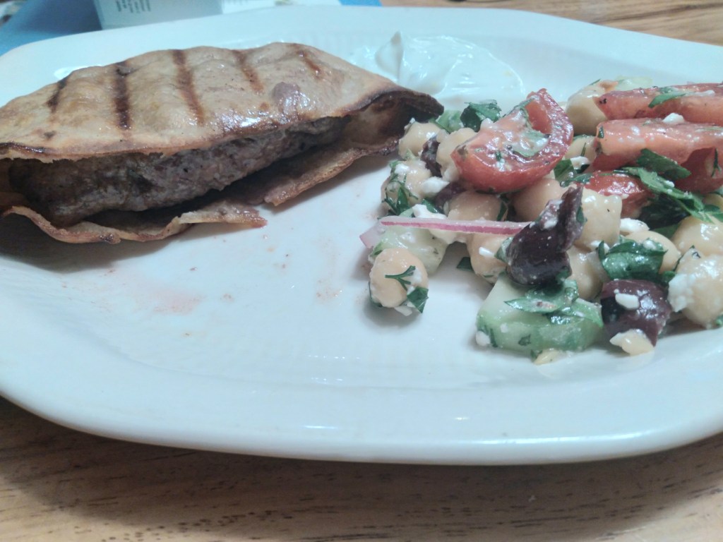 This recipe came from Julia Turshen’s book Simply Julia. A crunchy hamburger. A lovely middle eastern spiced meat patty stuffed into a pita and pressed down to fill all the space and grilled to crispy perfection! Served with a garlic yogurt sauce. This is a keeper. If you look online you find different versions. Some use fresh tomato of tomato paste in the meat along with parsley and grated onion.